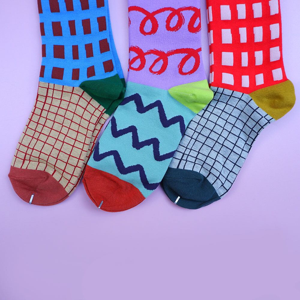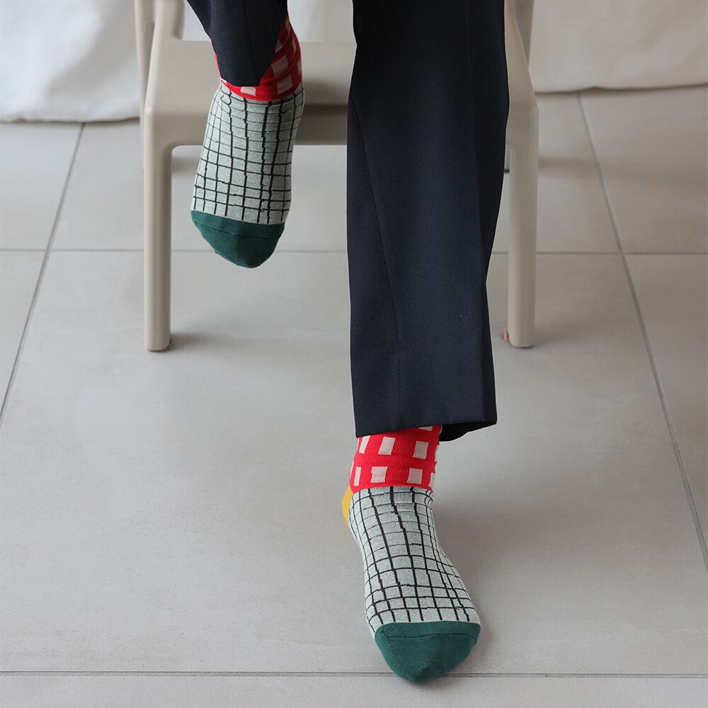 お店でもGOMAさんのバンブーファイバーの食器は人気ですが、そのムードがそのまま、ソックスになりました!服はベーシックが落ち着くけど、たまーに楽しいアイテムで遊んでみたい。そんなときに、こんな幾何柄ならしっくりくるかも。チェックやぐるぐるは、模様界のベーシックですからね!