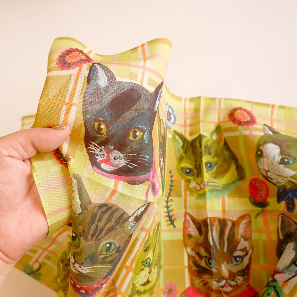 ナタリーが描く猫が散りばめられた大きなハンカチです。