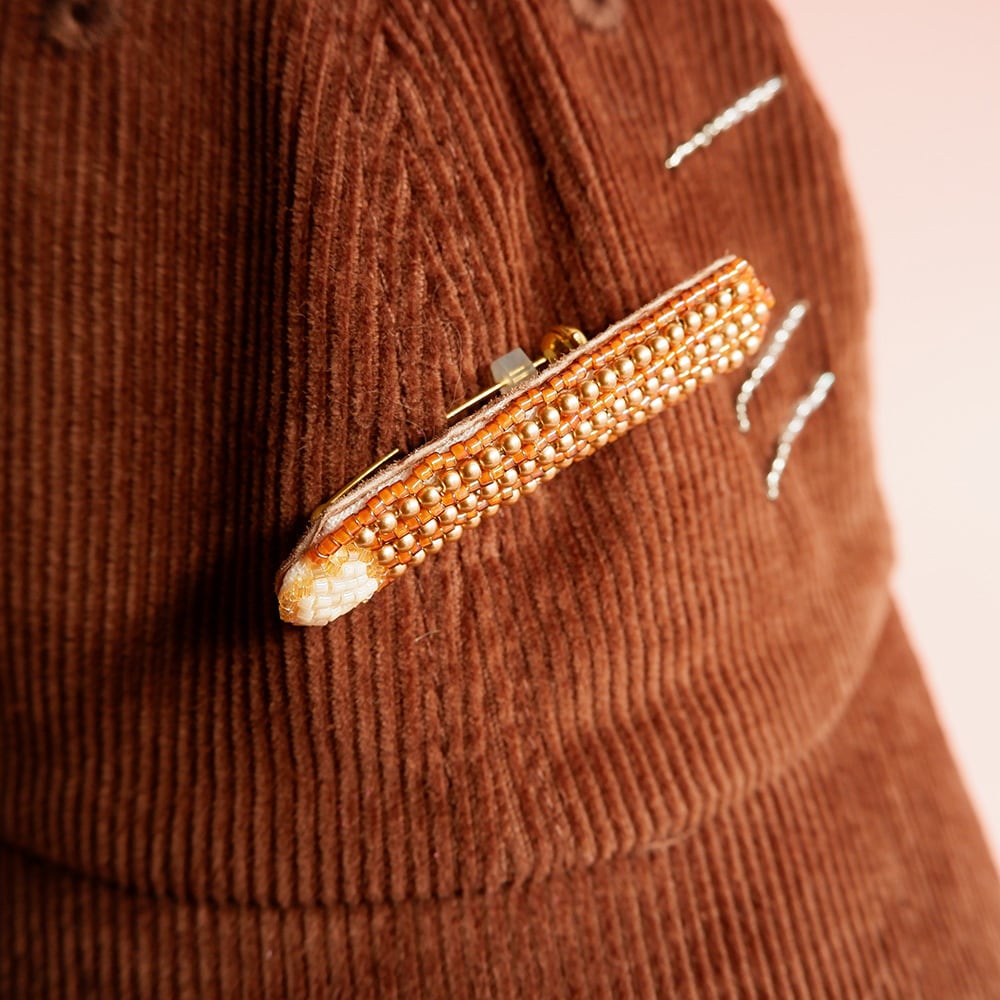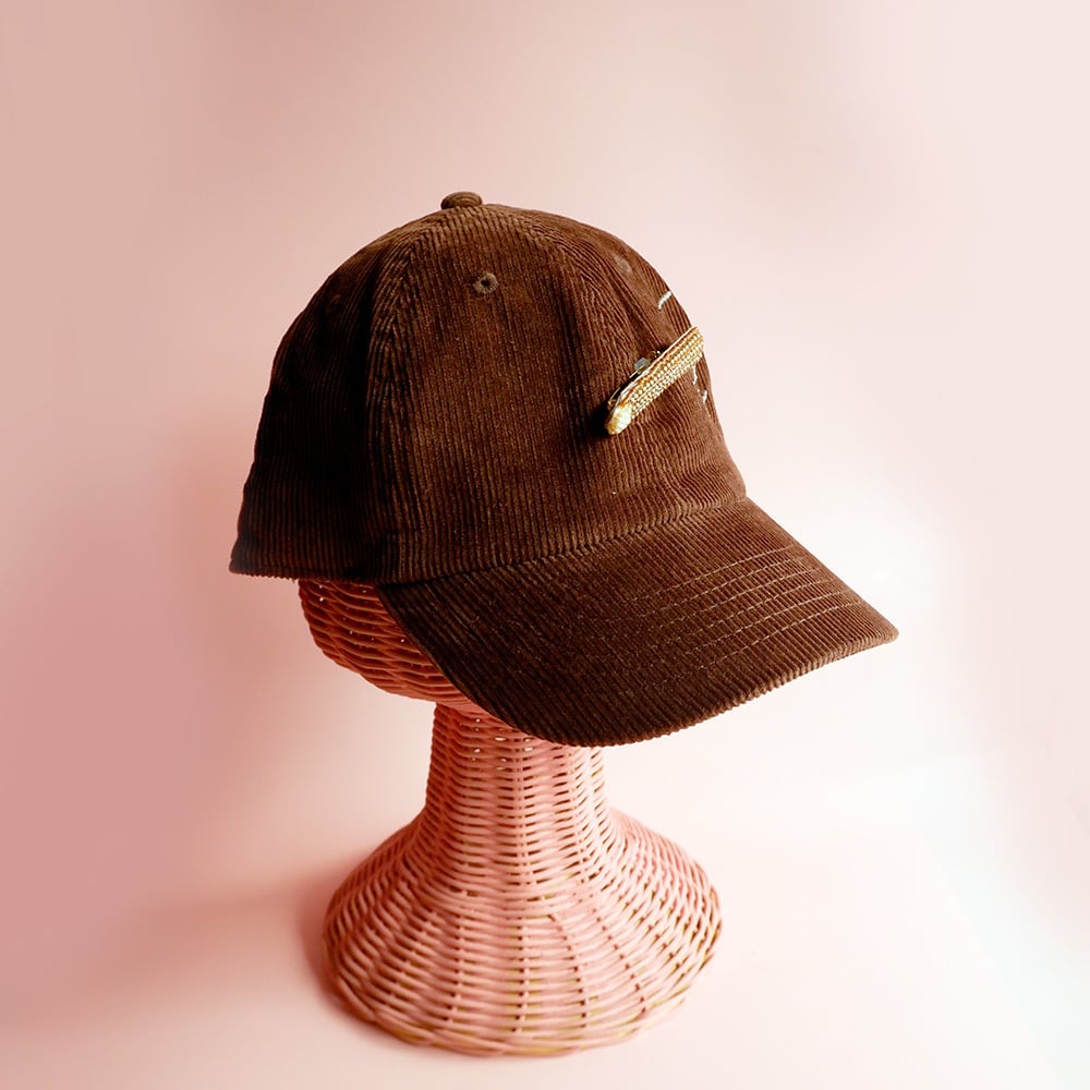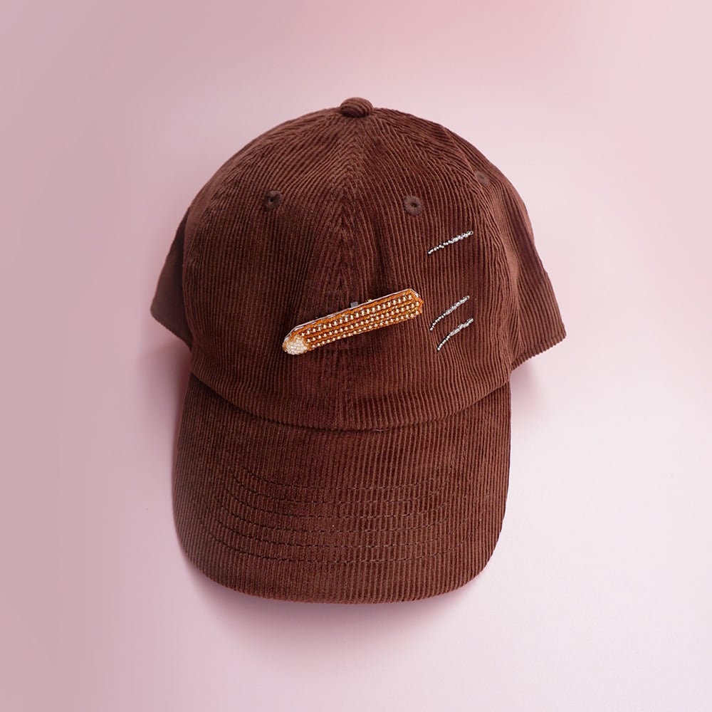 びゅんびゅん高速で飛ぶチュロスの帽子。 チュロスはブローチになっているので、他の物にも付けられますよ。