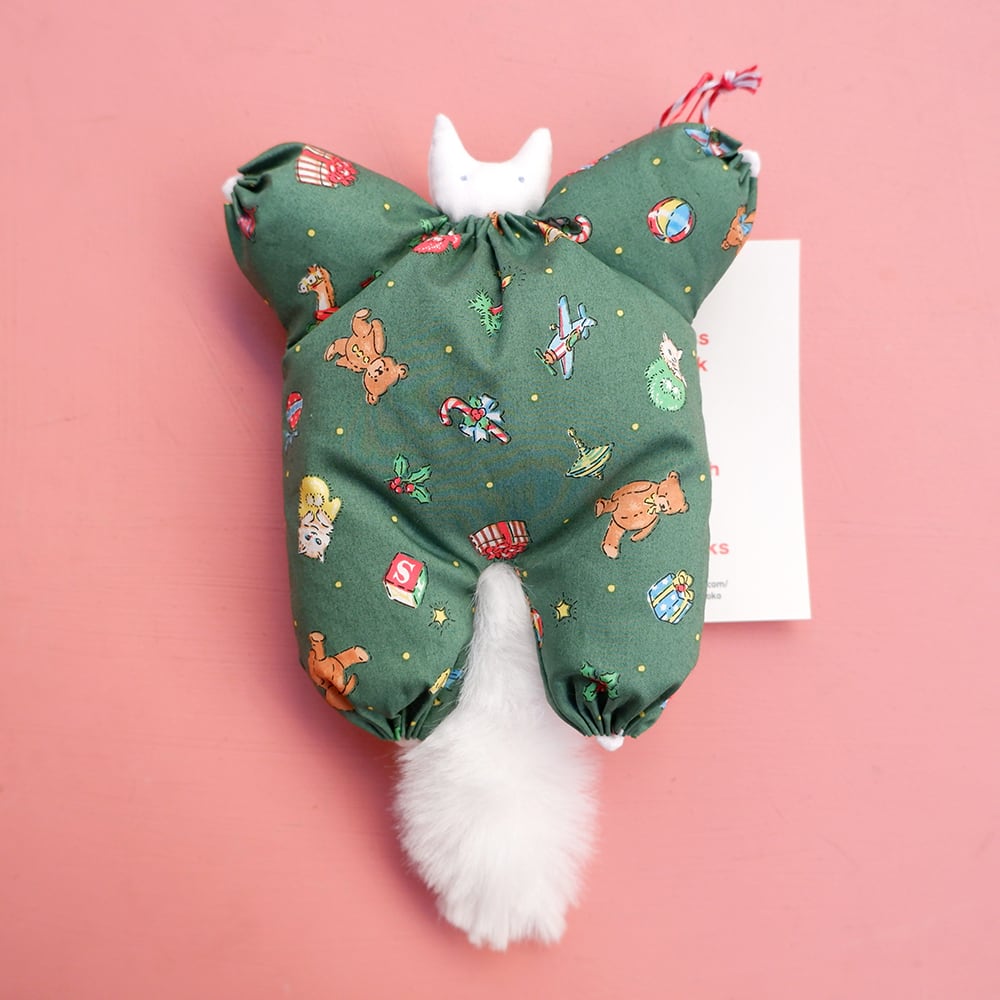 キュートな洋服を着たふわふわのネコ、ふにゃ猫ぬいぐるみ。