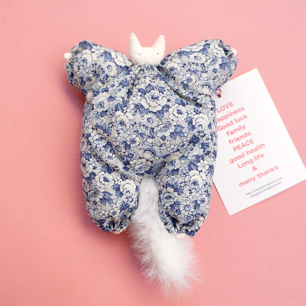 キュートな洋服を着たふわふわのネコ、ふにゃ猫ぬいぐるみ。