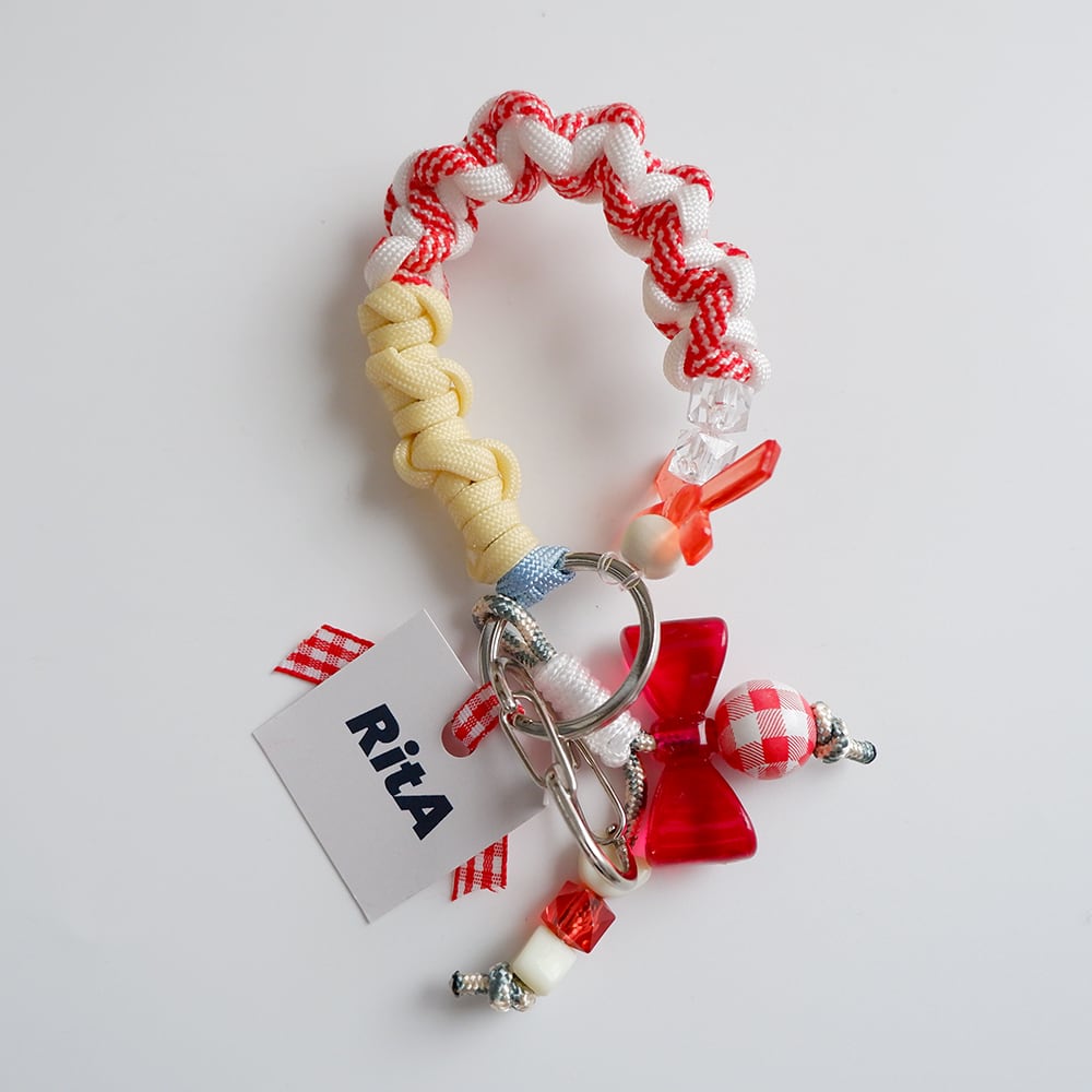 綺麗な色のマクラメと、ところどころに使われているパーツの組み合わせがキュートなスマホアクセサリー。指を入れて掴むのにちょうど良い輪っかです。