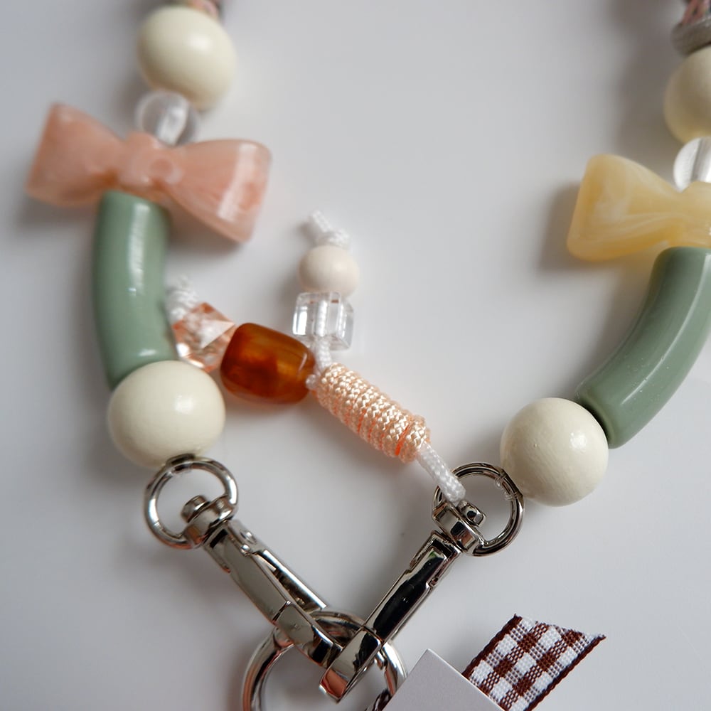 綺麗な色のマクラメと、ところどころに使われているパーツの組み合わせがキュートなスマホアクセサリー。腕がらくらく通の輪っかです。