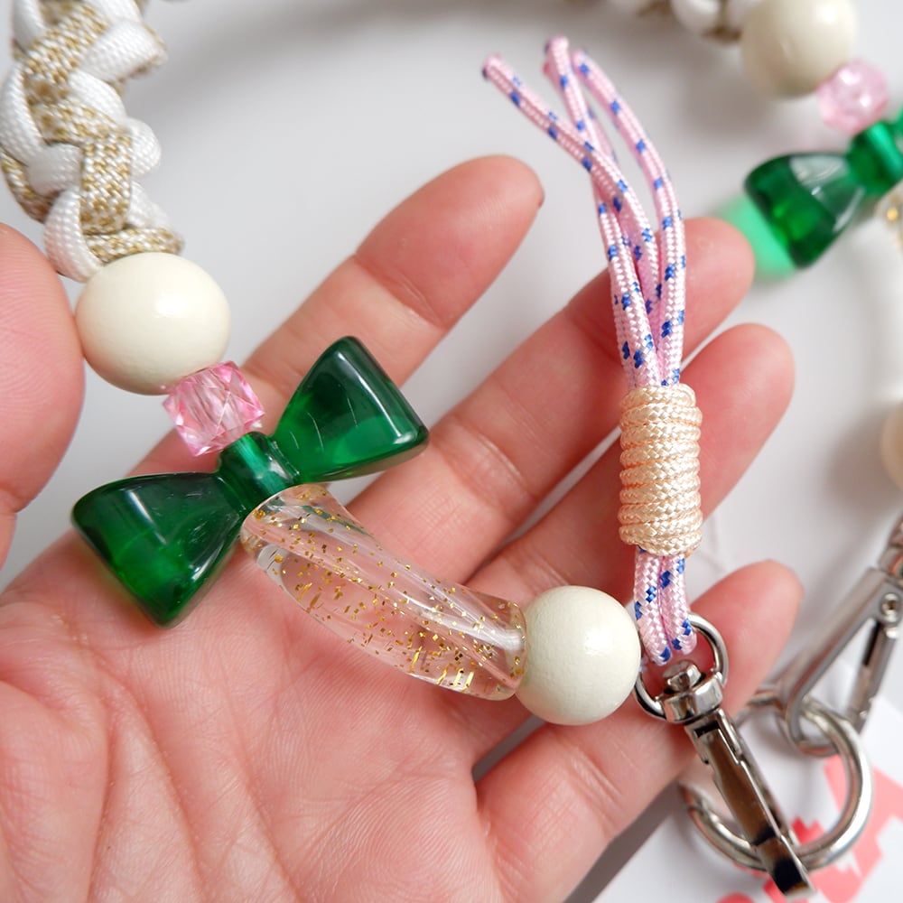 綺麗な色のマクラメと、ところどころに使われているパーツの組み合わせがキュートなスマホアクセサリー。腕がらくらく通るの輪っかです。