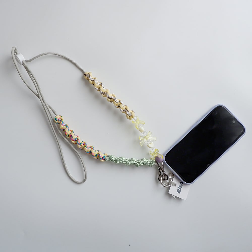 綺麗な色のマクラメと、ところどころに使われているパーツの組み合わせがキュートなスマホショルダー。