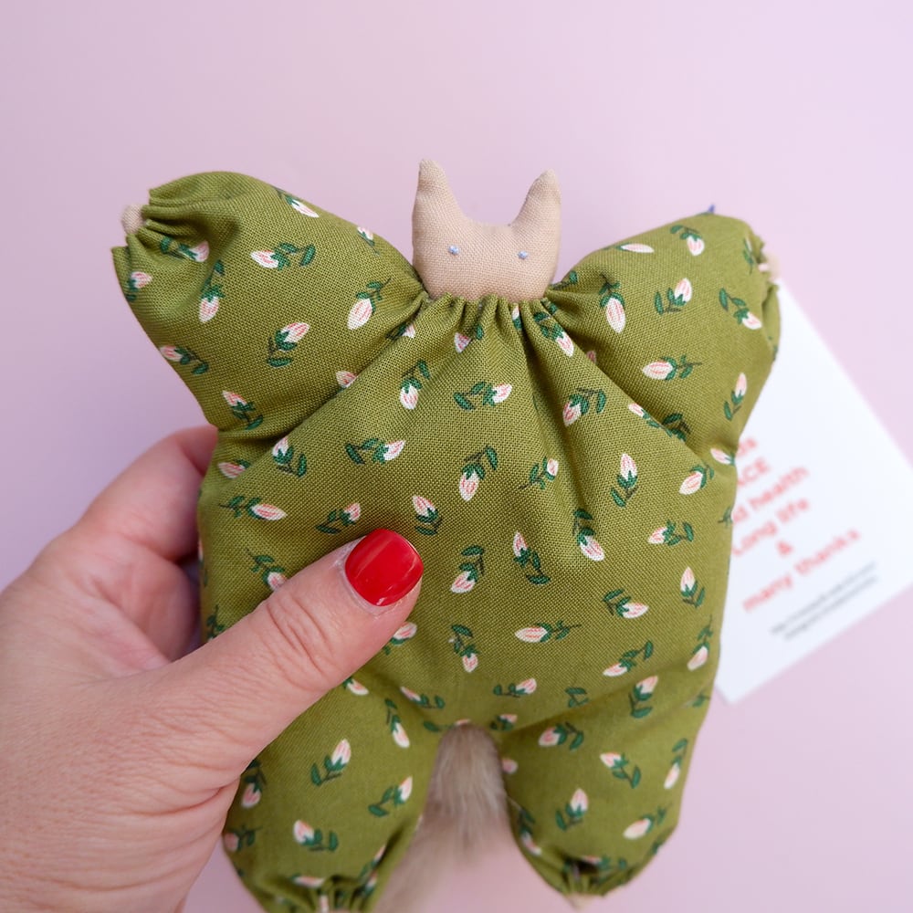 キュートな洋服を着たふわふわのネコ、ふにゃ猫ぬいぐるみ。