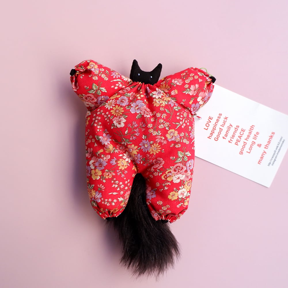 キュートな洋服を着たふわふわのネコ、ふにゃ猫ぬいぐるみ。