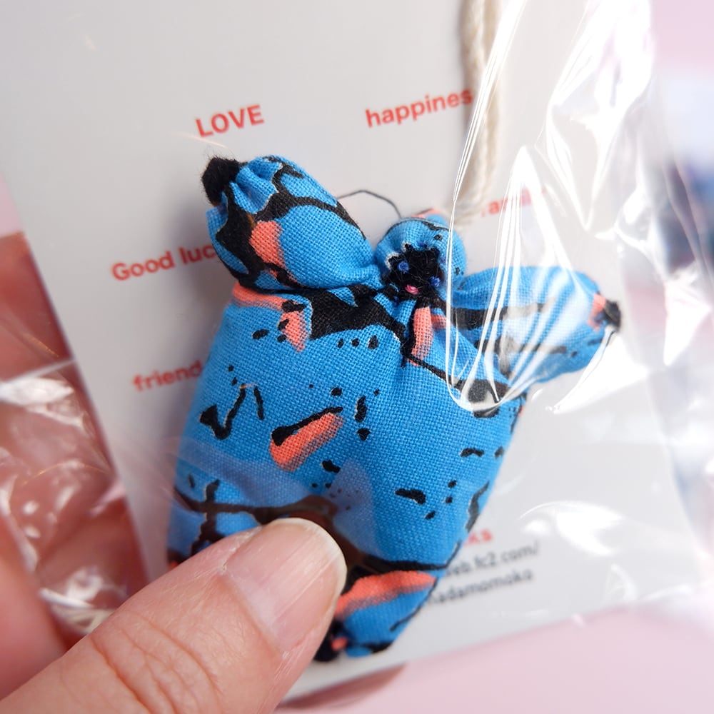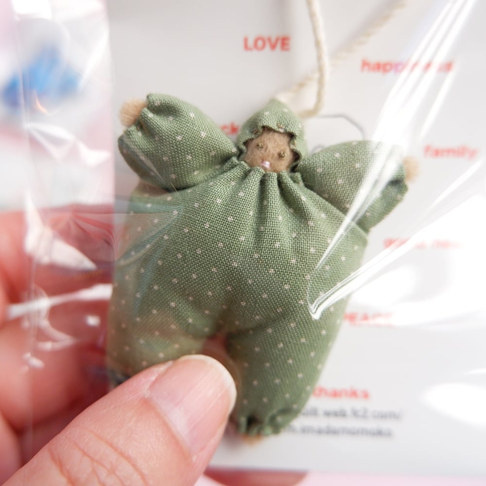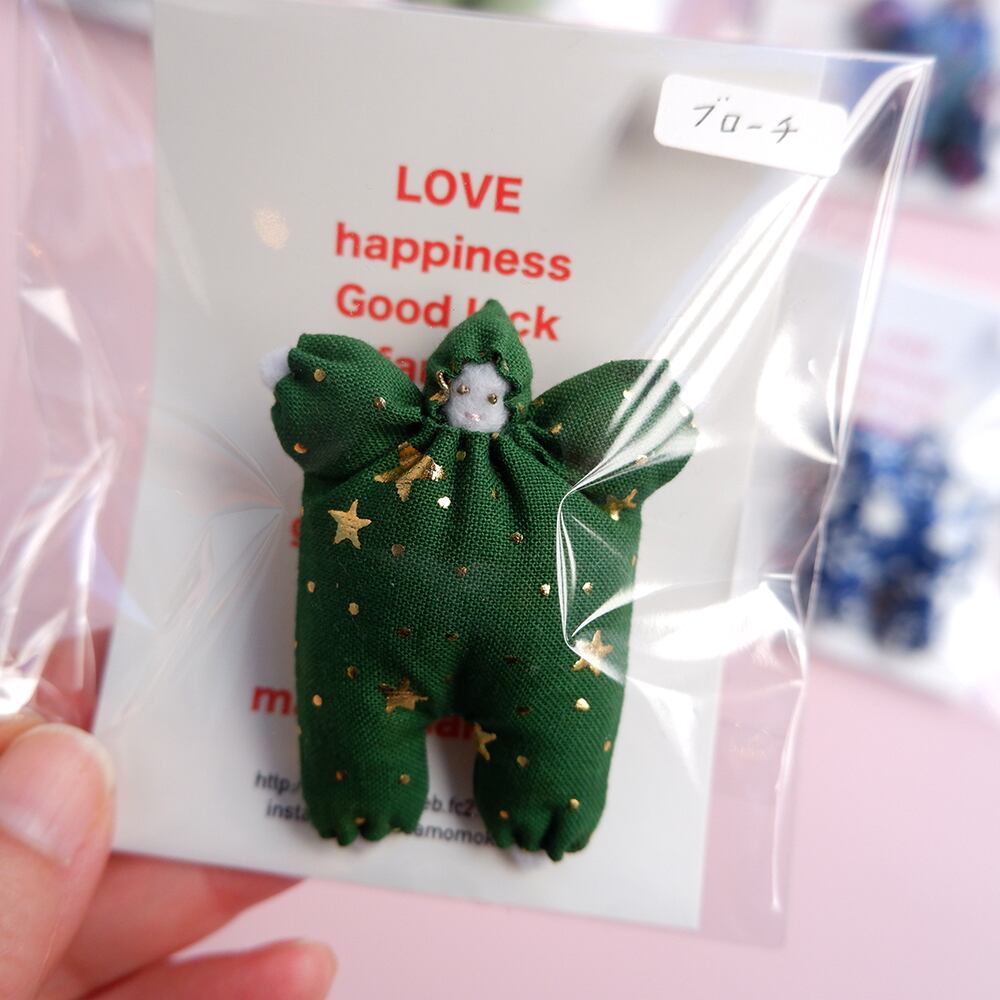 紐付き飾りは頭のてっぺんには長めのループが付いていますので、バッグの持ち手などにぐるりと付けることができます。ブローチもとっても軽いので、コートやバッグに付けると可愛いです。
