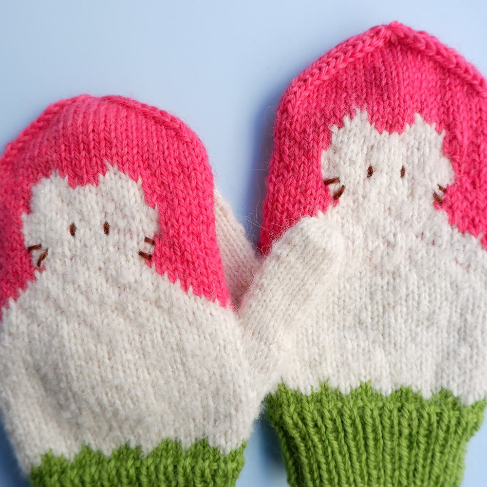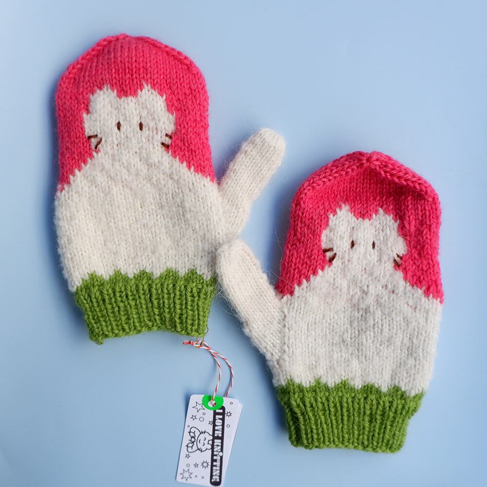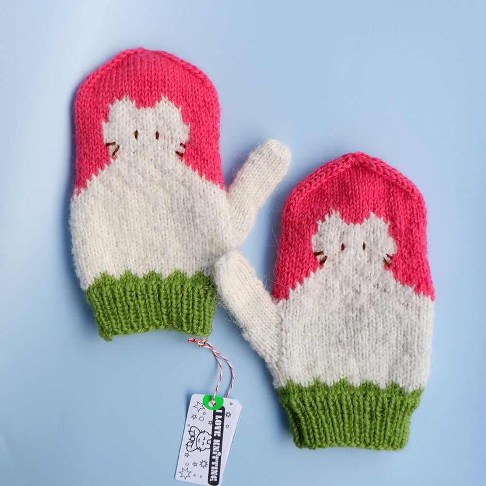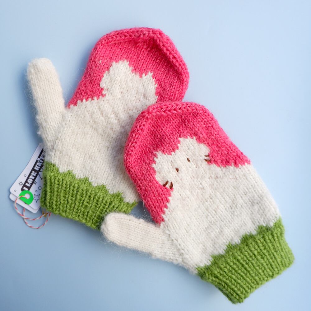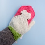 はっきりしたピンクとリブのウグイス色が可愛い、パペットみたいな手袋。