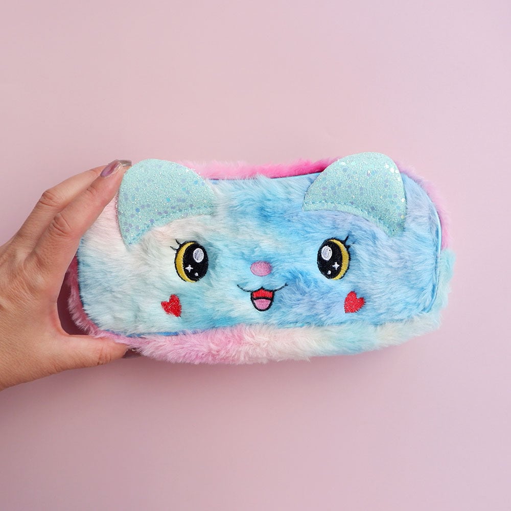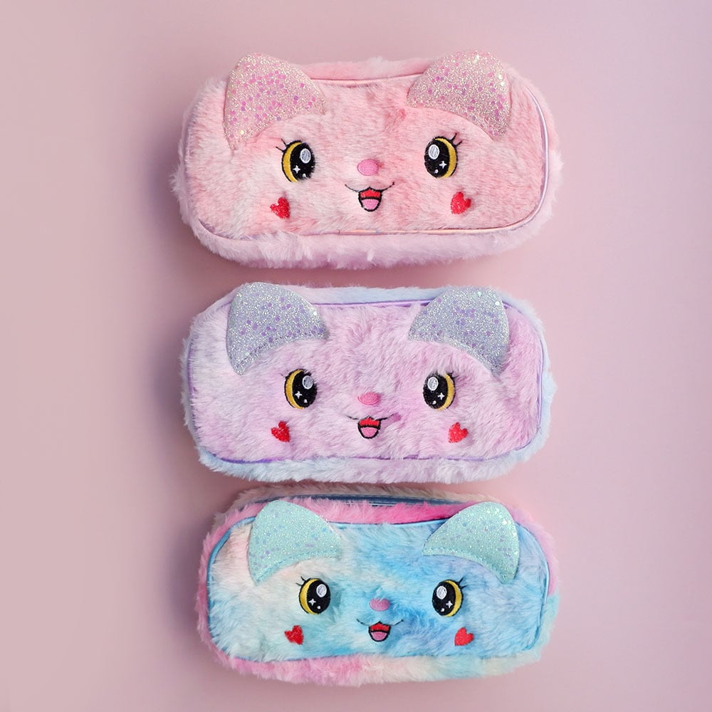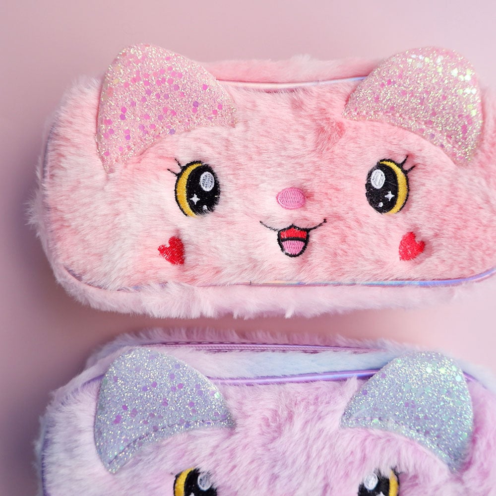 キラキラした目、ハートの頬っぺた、かわいい猫が笑っています。 見つめて楽しい、キュートなポーチです。 ●大きさ 21.5cm×10㎝ ●厚み 5㎝