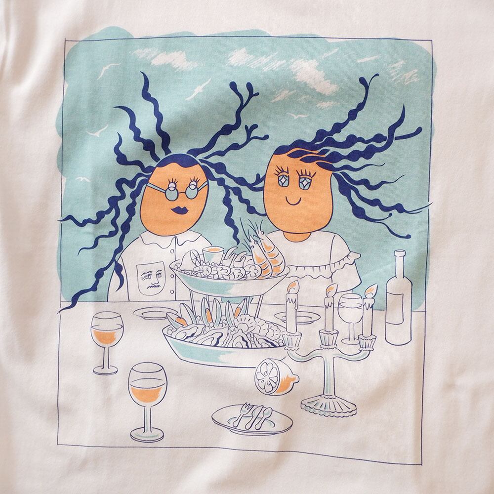 海辺のレストランでシーフードランチをする2人を描いた半袖Tシャツ。2人はコレクションのシャツやワンピースを着ています。
