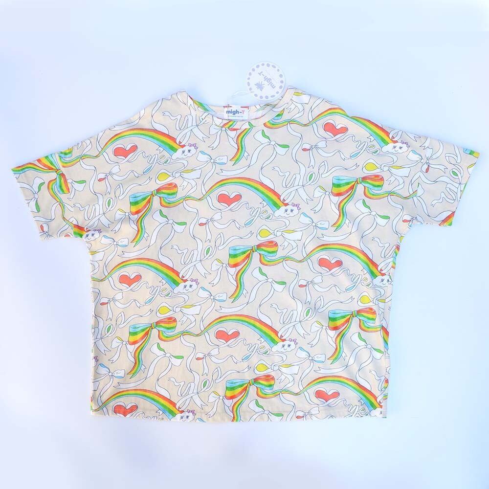 空の彼方までひろがる虹色のリボンでつながったyesの文字描いたプリントのTシャツ。ワイドなボディに、すっきりした袖のパターンのTシャツです。
